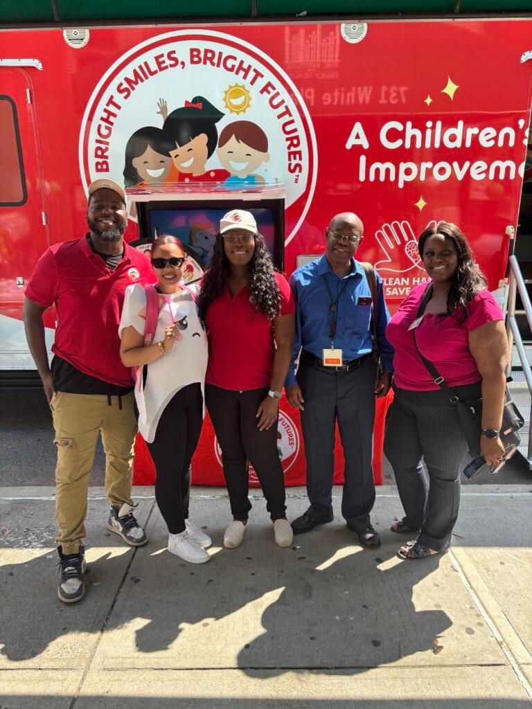 Institute staff (left to right) Donna Rios, Dental Practice Administrator at the Stevenson Family Health Center; Dr. Eric Gayle, CEO of the Institute for Family Health; and Laura Abdul-Henry, Dental Practice Administrator at the Walton Family Health Center, pose with staff (in red shirts) from the Colgate Bright Smiles Bus at Stevenson Family Health Center’s Back-to-School Health Fair on August 13. The Institute also hosted a back-to-school event at the Mt. Hope Family Health Center and participated in the Bronx’s annual Boogie on the Blvd event.